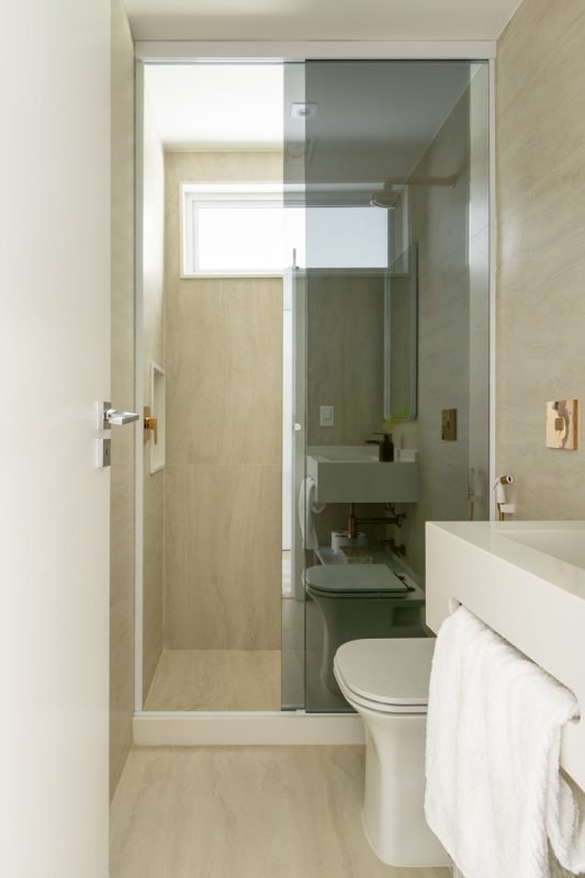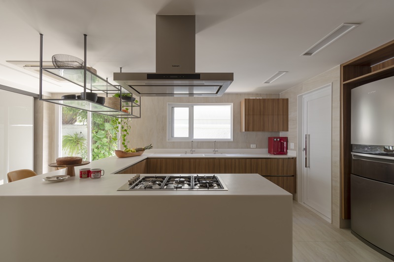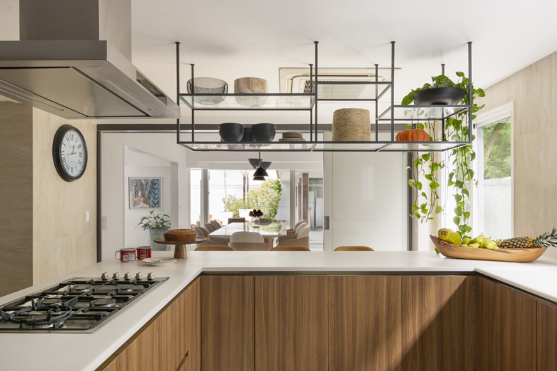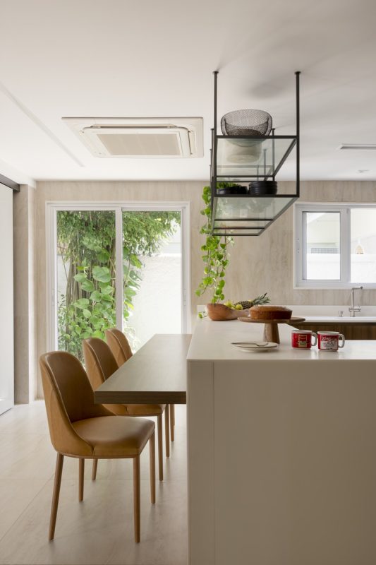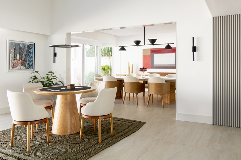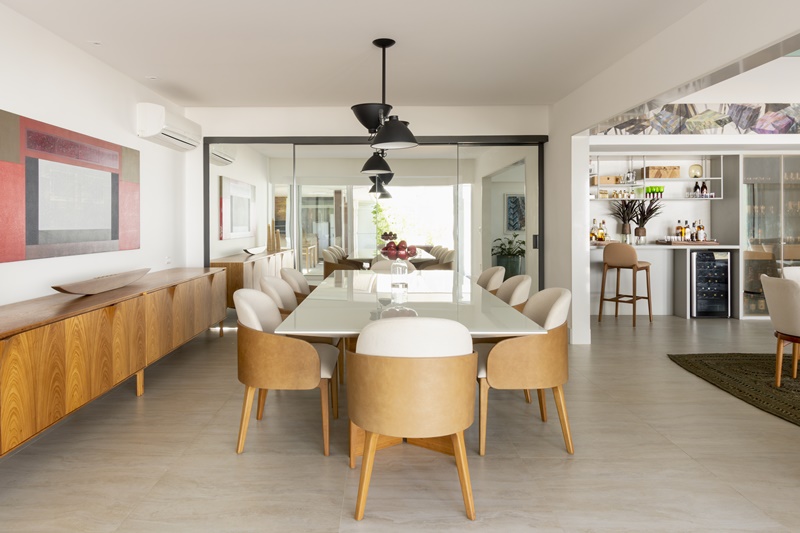 A decoração de estilo contemporâneo, com toques modernos, segue uma paleta de cores neutras, como cinza, branco, preto e madeira, para ressaltar os tons mais quentes dos quadros que os clientes já tinham. Para o piso da área social, foi escolhido um porcelanato de formato grande com aparência de mármore travertino, replicado também nas paredes da cozinha, em busca de unidade visual. Já as portas de correr que a separam da sala de jantar são de vidro pintado de branco por dentro e espelhadas por fora. “Executamos toda a bancada da cozinha em corian, em forma de U, com a possibilidade de ela ser iluminada no lado voltado para a sala de jantar. Já pranchão de madeira engastado na bancada serve de apoio para as refeições rápidas no dia-a-dia da família“, descreve a arquiteta. O material foi usado também para revestir a parede de fundo do bar da sala, com a opção de ser iluminada por trás para destacar, à noite, a prateleira aérea executada em serralheria branca.