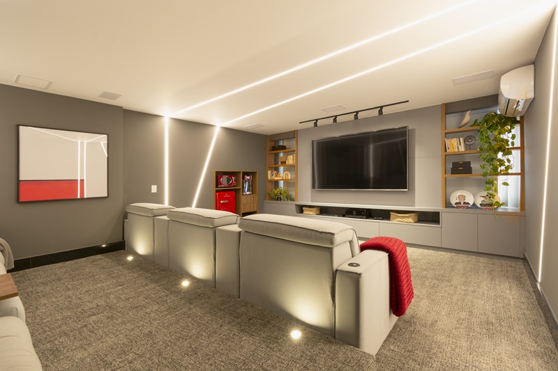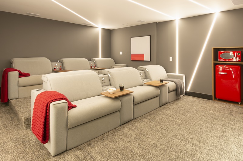 A sala de cinema é um capítulo à parte no projeto. Ela foi projetada para acomodar confortavelmente 12 pessoas, com direito a piso acarpetado pontuado por balizadores de luz e tablado na parte de trás para elevar as poltronas (que contam com sistema elétrico independente). No lugar do telão, o casal preferiu manter a tv que já tinha, de grandes dimensões e altíssima definição, e conectar caixas de som em pontos estratégicos do espaço. A parede lateral ganhou um armário embutido, com nichos para acomodar micro-ondas, frigobar e pipoqueira de visual retrô, na cor vermelha, deixando o clima mais divertido. Já os perfis de led que “rasgam” as paredes e o teto acrescentaram um ar mais moderno ao espaço, criando um jogo de luz de efeito cênico. “O cliente costuma brincar que vai passar a cobrar ingressos dos amigos dos filhos, que agora vivem lá“, conta Paula. “O maio desafio deste trabalho foi executar o projeto com os clientes morando no segundo pavimento. Tivemos que montar uma estrutura de cozinha na área externa da casa para atendê-los durante o período de obra“, finaliza.