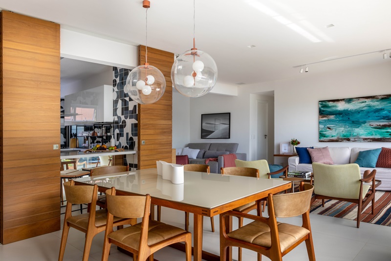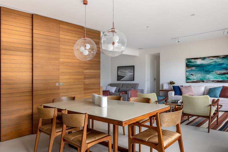 A cozinha, um dos principais lugares para o casal que ama cozinhar e receber amigos, foi integrada à sala de jantar em forma de península, com portas de correr que permitem abrir ou fechar o ambiente conforme necessário. E o melhor: possibilita usufruir ainda mais da vista deslumbrante. Um jogo de luzes e sombras, onde os materiais escolhidos, com sua transparência sutil, acentuam a beleza do espaço.