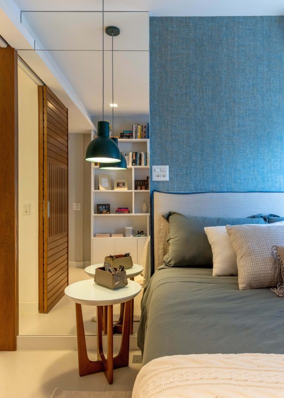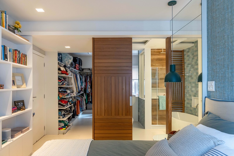 O novo layout do apartamento inclui um hall de entrada que conecta o quarto, o closet e o banheiro, aproveitando a vista da floresta e garantindo privacidade para o casal. A suíte, agora ampla e confortável, foi projetada para ser um ambiente multifuncional, com um pequeno escritório integrado e uma banheira posicionada para desfrutar da iluminação natural.