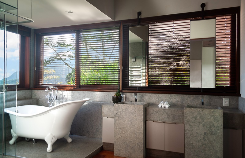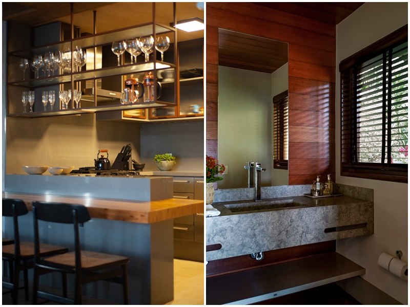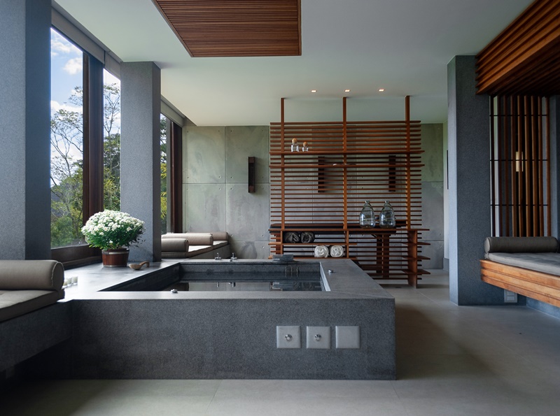 Os materiais foram pensados para não brigar com o entorno. “Usamos basicamente madeira ecológica, pedra, aço corten e vidro, integrando o máximo possível todos os ambientes”, explica o arquiteto. E o resultado é um projeto bastante contemporâneo, bem longe do estereótipo de chalezinho na montanha. Os clientes não queriam uma casa grande e o briefing foi de que precisavam de um lugar onde pudessem ficar em paz e fazer um detox da cidade.