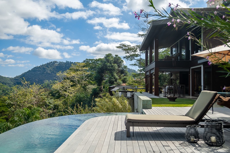 Última residência de um condomínio, por ficar no alto da montanha, a vista é incrível. Totalmente integrada à paisagem, a casa surge em meio à mata, parecendo pousar sobre o terreno. Sua implantação, voltada para leste, recebe o sol da manhã na fachada principal e áreas comuns; a ventilação cruzada foi um ponto importante priorizado pelo escritório já que a região é muito úmida e precisava ser bem arejada.
