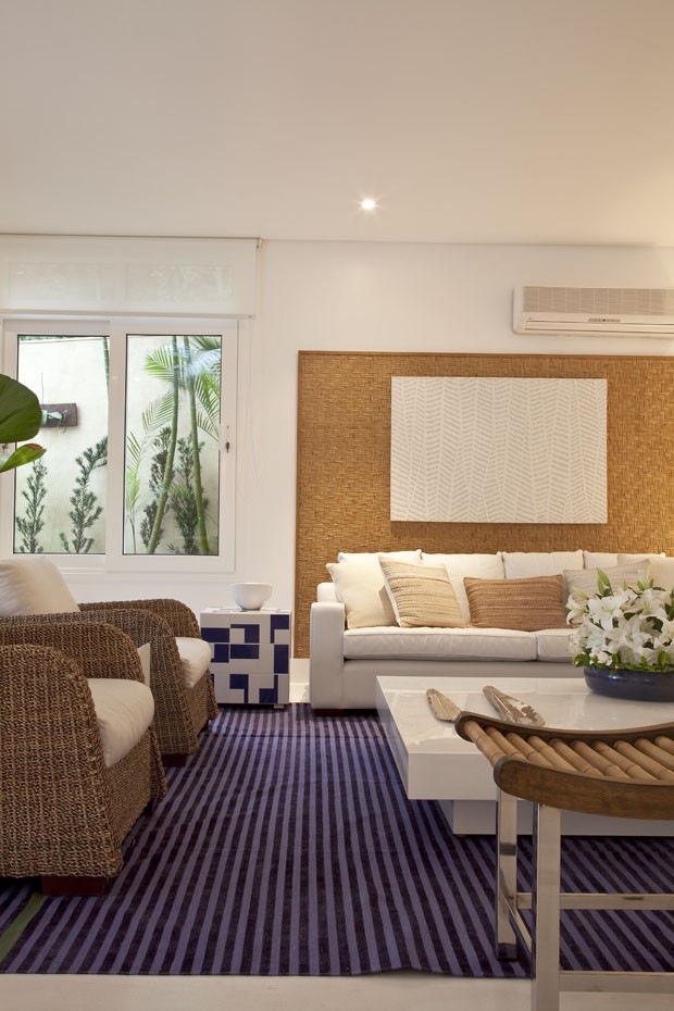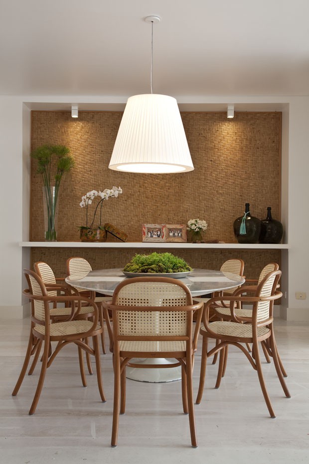 O material “estrela” que aqueceu o projeto é a palha trançada, eleita para revestir painéis na sala de estar, de jantar e nos quartos. “Uma das características marcantes da obra é a mistura de materiais naturais e outros mais urbanos, como a laca da mesa”, revela a projetista.