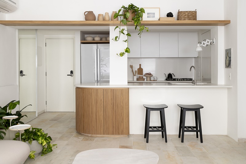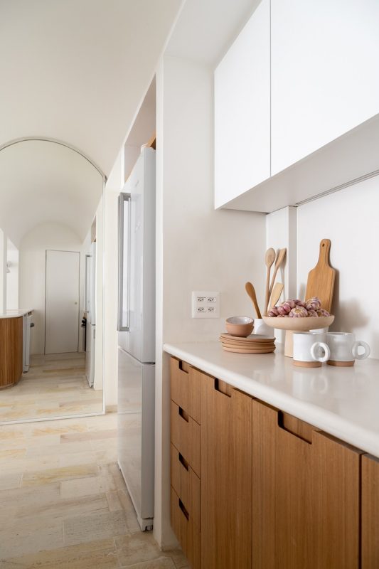 “Nosso maior desafio neste projeto foi colocar em prática a ideia do walk-in closet, mantendo o armário de porta de abrir original antiguinho e instalando na frente dele uma estante com fundo transparente para deixar a luz passar. Fazer o teto curvo da cozinha também foi um grande desafio, mas no final deu tudo certo e o Wallace adorou o resultado“, conclui a arquiteta Isabella Lucena.