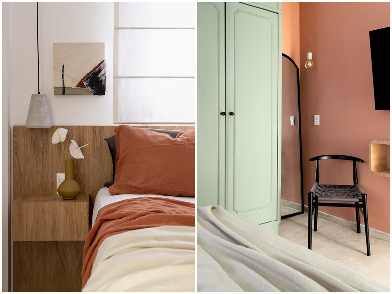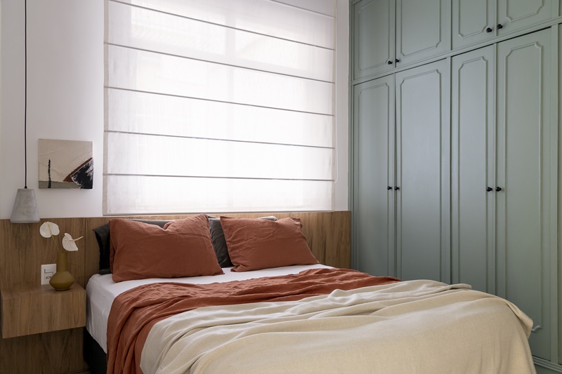 O quarto dos fundos foi transformado na suíte do morador a partir da incorporação do único banheiro que havia no corredor. O antigo armário foi mantido, restaurado e pintado de verde, e ganhou puxadores pretos, mesma cor da moldura de ferro do espelho apoiado no chão. Desenhada pela arquiteta, a cabeceira da cama foi executada em marcenaria com acabamento em freijó natural.
