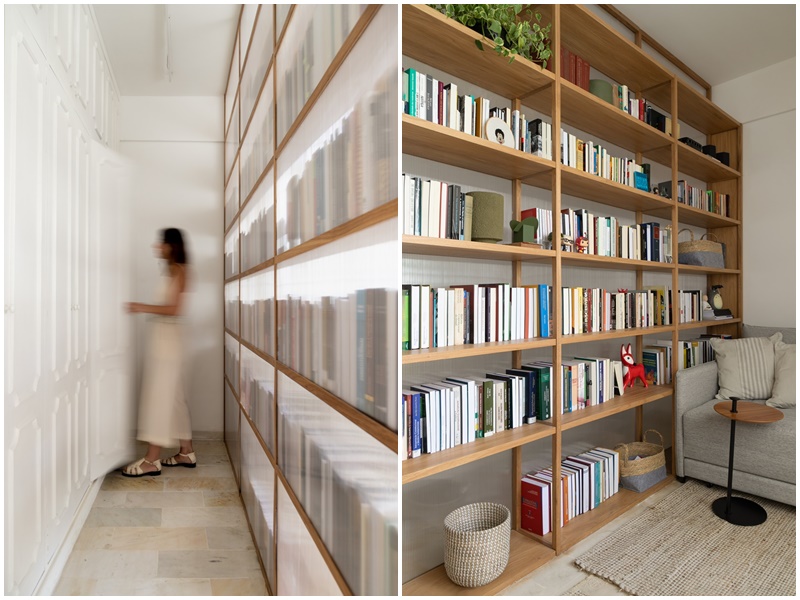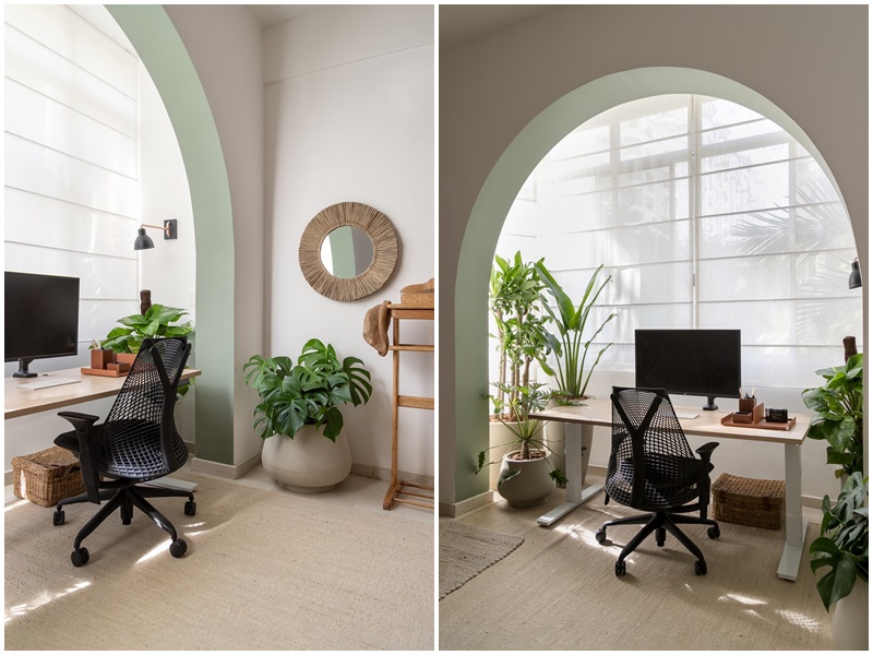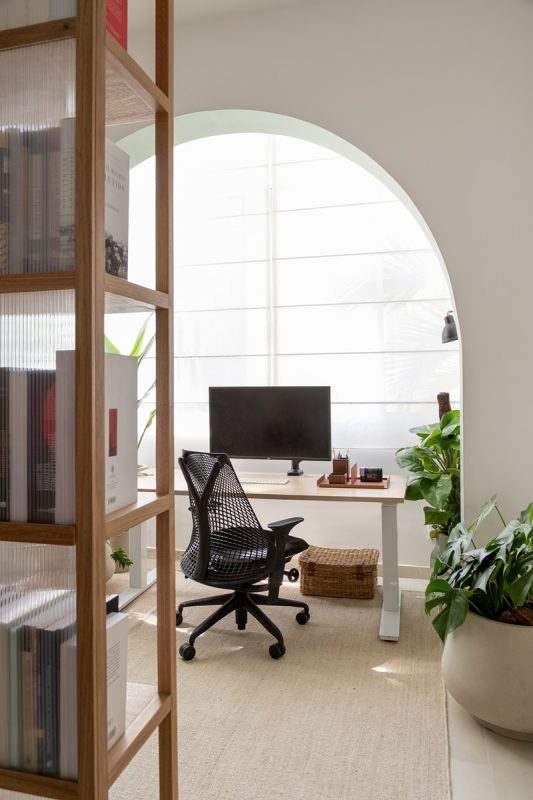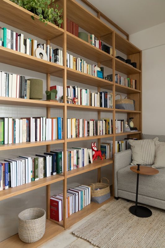 Já o outro quarto foi transformado no escritório, podendo também ser usado como quarto de hóspedes: Como a arquiteta precisava de um fundo visualmente interessante para as lives e entrevistas eventuais do Wallace, a bancada de trabalho foi posicionada na varanda, voltada para a janela, e uma estante para livros foi projetada ao fundo, na frente do armário antigo, criando assim um walk-in closet. “Fizemos um portal curvo na varanda para delimitar a área da bancada e manter o estilo da decoração do restante do apartamento e fechamos a parte de trás da estante com acetado transparente para deixar a luz natural entrar no corredor do closet, evitando assim a sensação de claustrofobia“, explica a arquiteta.