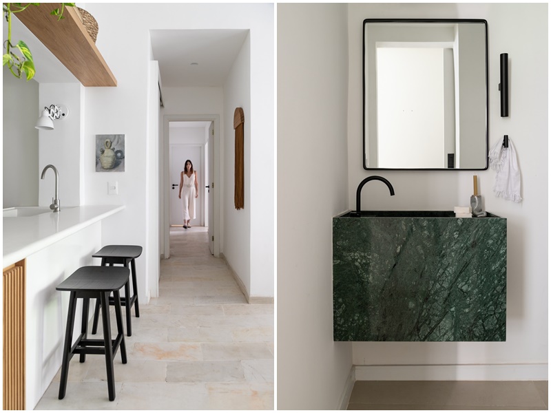 Segundo a arquiteta, o piso de pedra São Tomé encontrado no apartamento deu o tom do projeto, direcionando-a para um estilo pautado por materiais naturais, paleta de cores em tons leves de cru, areia e off white, formas orgânicas com texturas aconchegantes e madeiras naturais para contrastar com a frieza do material do piso. “Tivemos que restaurar a pedra, pois ela estava muito suja. Também completamos o piso da atual cozinha com pedras novas, onde originalmente havia um lavabo e um quarto de serviço“, informa ela.