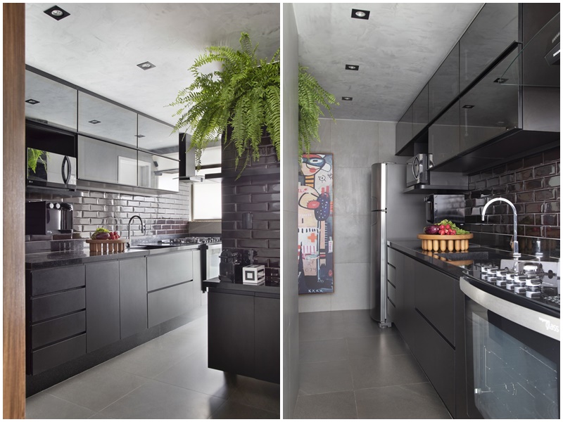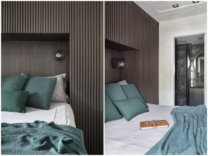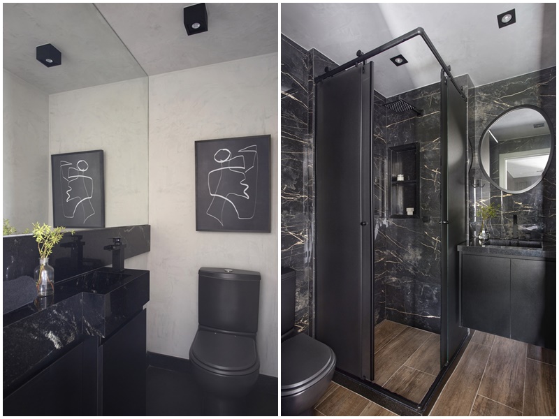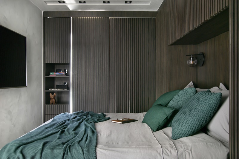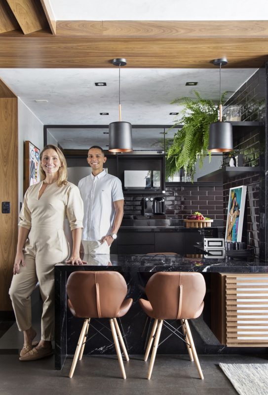 Na cozinha, os profissionais destacam a marcenaria com vidro reflecta nero nas básculas dos armários superiores e a predominância dos tons cinza chumbo e preto no décor. No quarto do morador, a marcenaria escura também é o ponto alto do cômodo, com armários e porta de acesso à varanda em madeira ripada que se camuflam nos painéis de parede, executados no mesmo padrão. “Este recursou impediu que os armários pesassem visualmente no espaço e ainda criou uma unidade estética”, explica Livia Amendola.