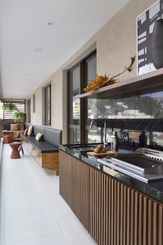Por fim, a varanda gourmet virou o espaço mais disputado em dias de casa cheia, graças ao banco enorme em L que explora todo o comprimento do espaço, criando ali uma área social informal perfeita para acomodar muitas pessoas. “Nosso maior desafio neste trabalho foi, sem dúvida, abusar de tons escuros sem deixar os ambientes visualmente pesados”, finaliza Rômulo.