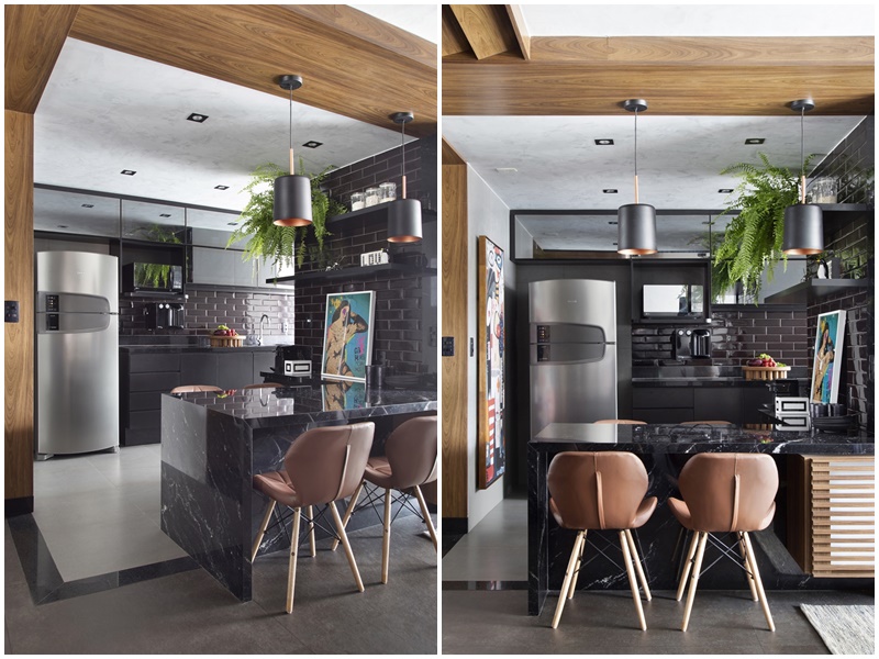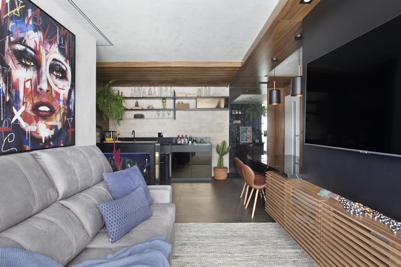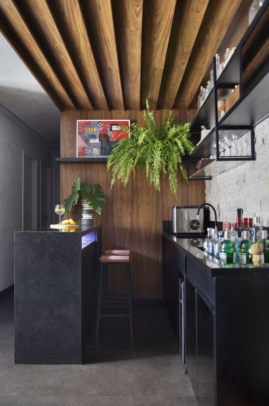 O cliente, um empresário de 38 anos que é sócio de um bar voltado para o público jovem e já morava no imóvel, apresentou à dupla referências em tons mais fortes e marcantes, como a madeira mais escura, o preto e cores profundas, para imprimir no projeto personalidade, ousadia e, sobretudo, sofisticação. Ele também pediu ao escritório que todo o apartamento refletisse essa atmosfera mais intensa e moderna e que seu quarto tivesse pouca entrada de luz para os dias que precisasse descansar mais. “Como ele é apaixonado por aquarismo e chegou a fazer cursos sobre o tema, reservamos um espaço sob a bancada do bar da sala para instalar um grande aquário”, conta Rômulo Costa.
