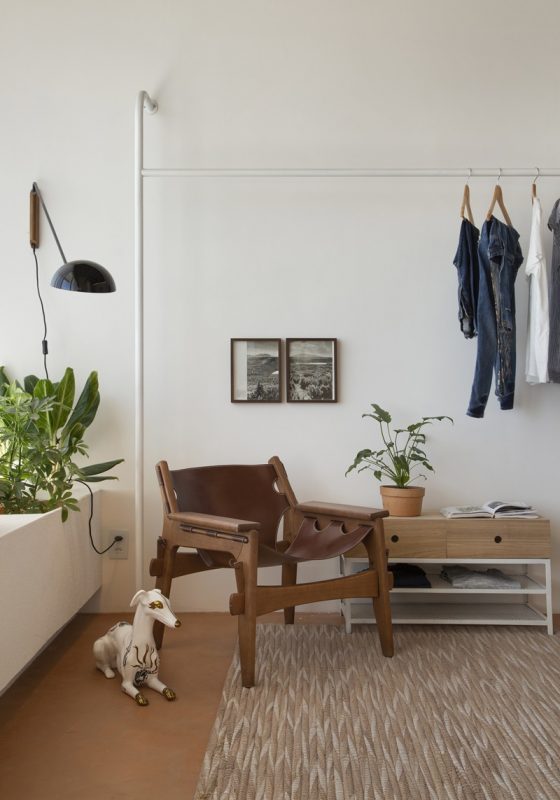 · O open closet é feito com tubos metálicos, solução descolada, bem mais econômica e versátil do que armários planejados.
