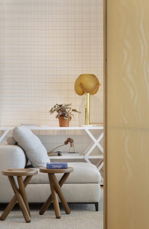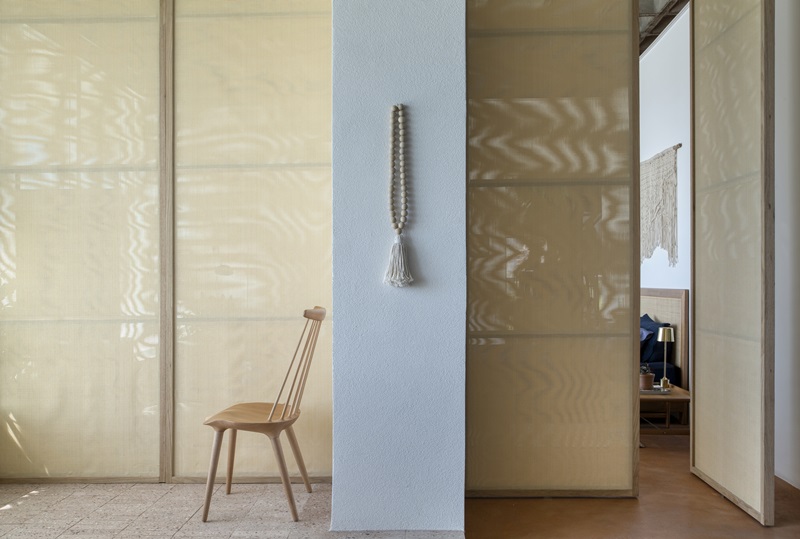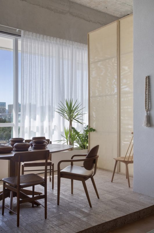 · No lugar de portas, a designer usou painéis pivotantes vazados do chão ao teto, com fechamento em palhinha, permitindo que os espaços fiquem mais fluidos, arejados e integrados.