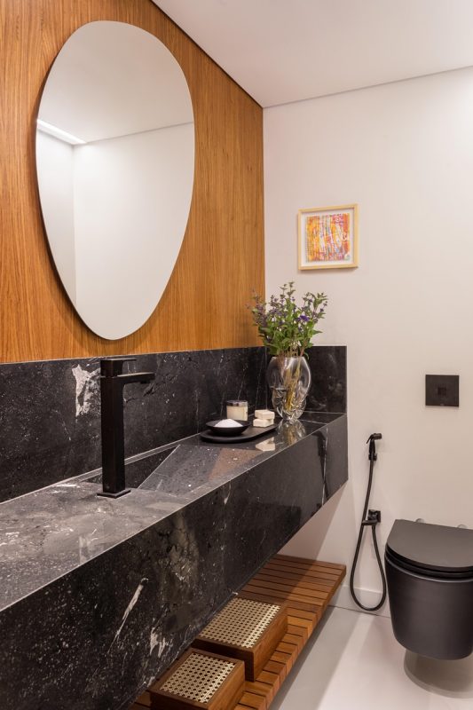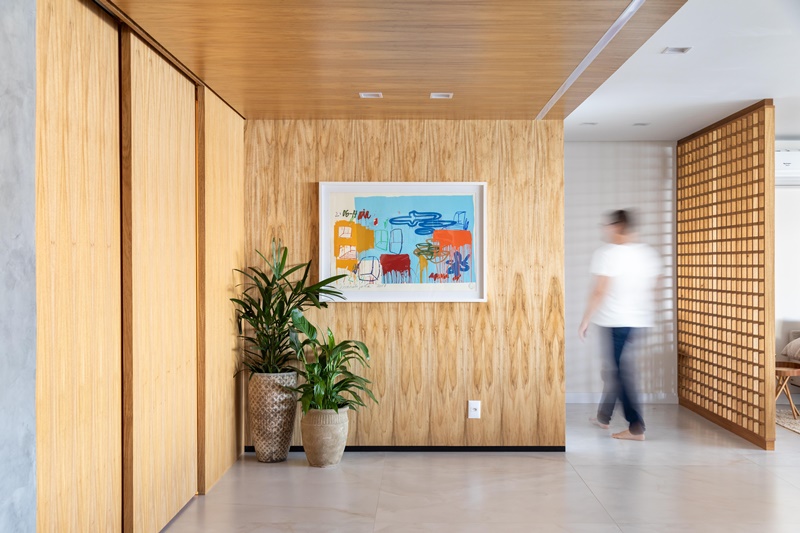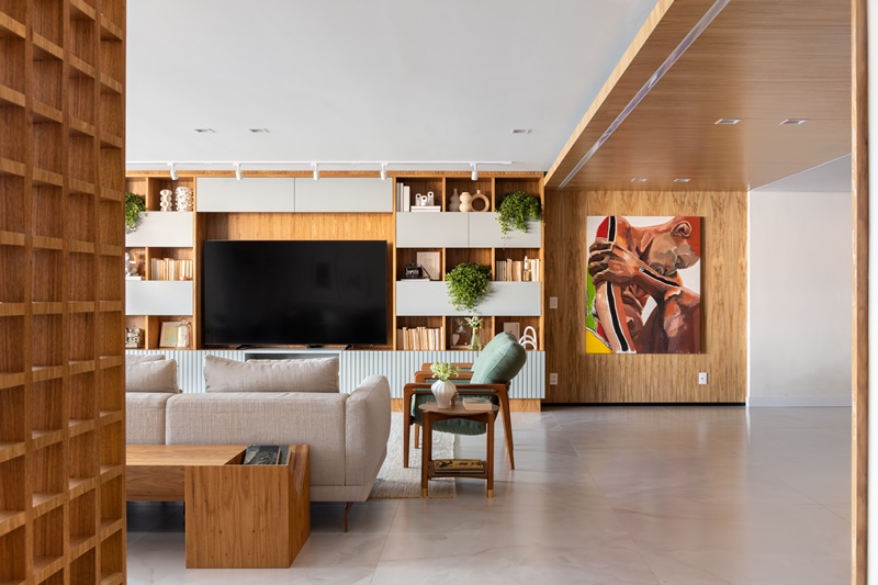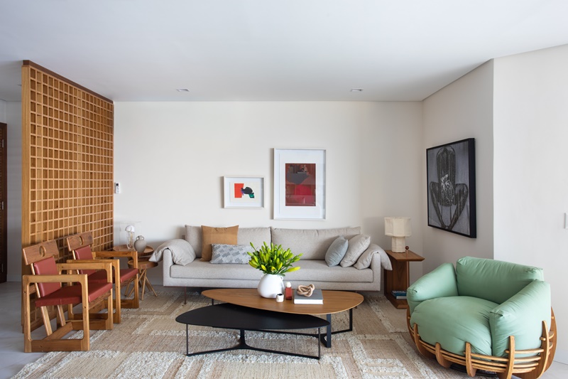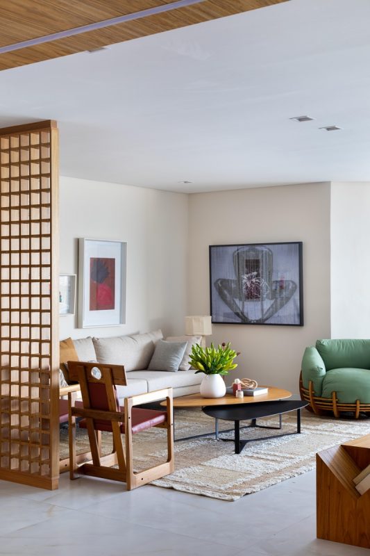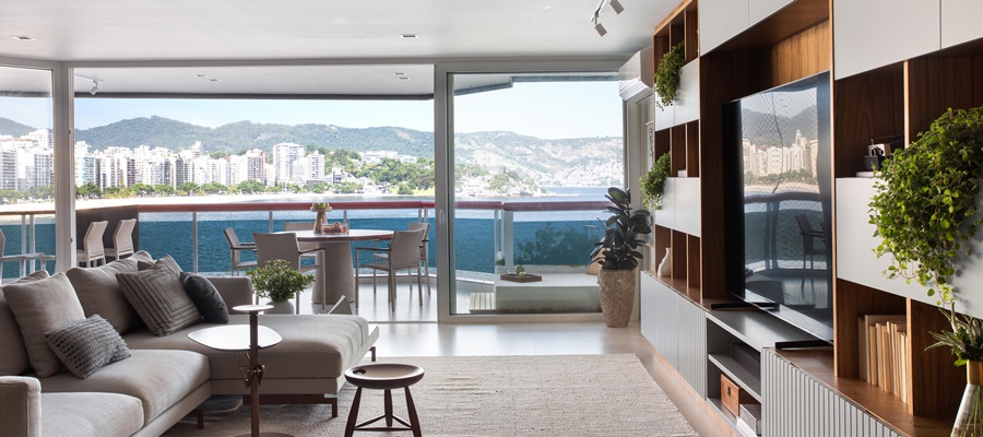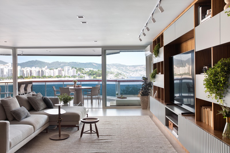 Já no quesito “materiais e acabamentos”, na área social, o arquiteto lançou mão de tons neutros, a exemplo das paredes off white, o piso em porcelanato bege levemente marmorizado e as marcenarias desenhadas por ele próprio, sob medida, com acabamento em freijó natural. “Com isso, conseguimos destacar o acervo de obras de arte dos moradores e manter o protagonismo da linda paisagem externa”, finaliza Henrique Ramalho.