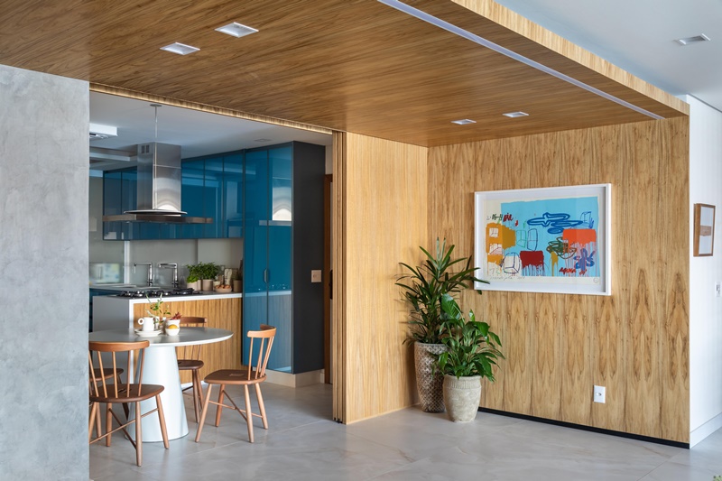 Na decoração, todo o mobiliário é novo. Do endereço anterior foram aproveitadas somente as obras de arte da família, com destaque para os quadros dos artistas Tomie Othake, Eduardo Sued, Marcelo Solá e a tela grande de Rodrigo Pedrosa (esta última, exposta no painel de madeira ao lado da estante da sala). Como o casal aprecia muito arquitetura e tem predileção por uma linguagem moderna e contemporânea, o arquiteto apostou em peças assinadas por grandes nomes do design brasileiro, com destaque para as poltronas Cuiabá (de Sergio Rodrigues), as poltronas Alice (de Marcus Ferreira), a poltrona Ninho (da Lattoog), o banco Bandeirola (de Ivan Rezende), a mesa de jantar Dinn (de Jader Almeida), as cadeiras Helga (do Estudiobola) e a luminária pedente Ufo (de Fernando Prado).