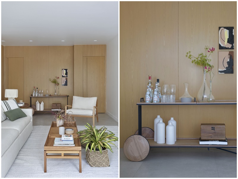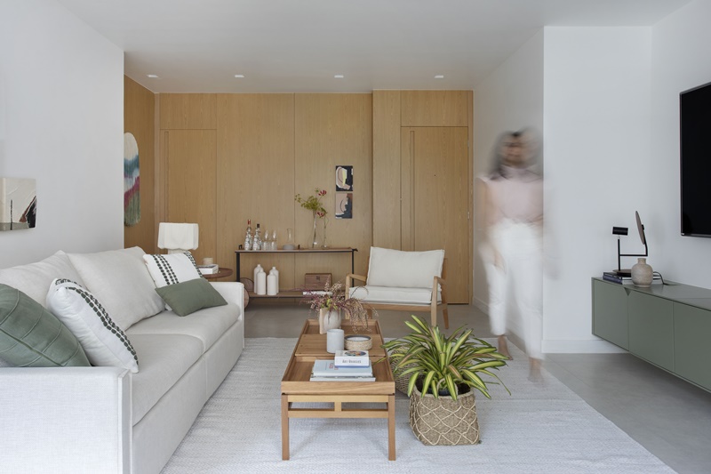 Um jovem casal de médicos, ambos na faixa de 34 anos e sem filhos, já morava neste apartamento de 115m2, na Lagoa (bairro na Zona Sul do Rio de Janeiro), quando decidiu encomendar às arquitetas Marina Dipré e Victoria Greenman, do Studio Duas Arquitetura (@studioduas.arq), um projeto para integrar os ambientes da área social e trazer mais personalidade e aconchego não só à sala como também ao quarto onde eles dormiam. “No geral, os clientes queriam um espaço confortável para receber amigos, além de atender aos usos do dia-a-dia, já que eles amam ver filmes e séries em casa“, conta a arquiteta Mariana. “Especificamente, eles nos pediram uma mesa grande, um espaço de bar, aparador, um sofá confortável, uma tv grande e um sistema de som embutido no forro. Na decoração, eles disseram que preferiam ambientes com base neutra, madeira clara e alguns pontos coloridos“, acrescenta a sócia Victoria.
