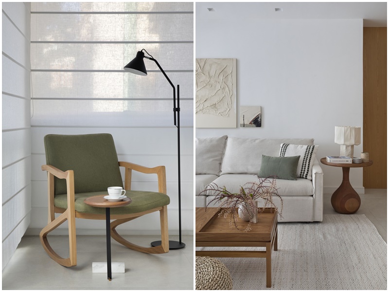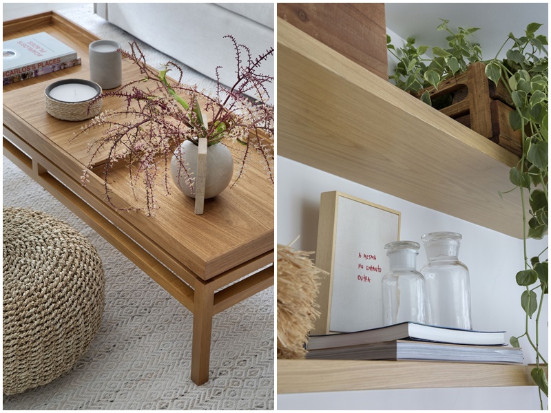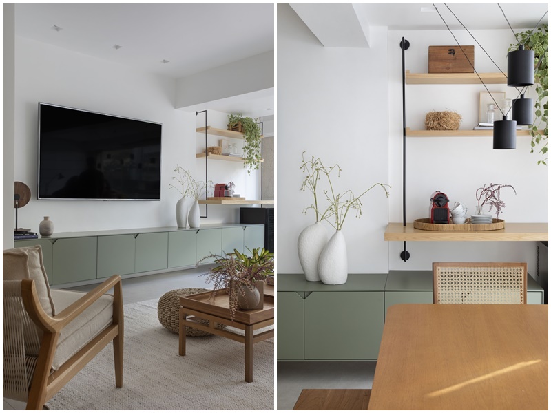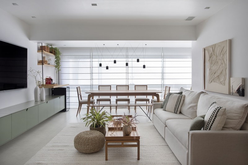 Em se tratando de alterações na planta do imóvel, as arquitetas integraram a varanda com a sala e nivelaram o piso para obter unidade visual. Na decoração, que segue um estilo contemporâneo, leve e despojado, elas optaram por uma base neutra, que evidencia a madeira, os materiais e as cores escolhidas. Para compensar o piso frio da sala, por exemplo, elas revestiram algumas paredes com painéis de marcenaria, com acabamento em carvalho natural, e acrescentaram texturas naturais e mobiliários de madeira para trazer aconchego e aquecer o espaço. “O colorido do décor vem basicamente da laca verde do rack suspenso, ainda assim num tom acinzentado para não quebrar a sensação de leveza do projeto“, explica a arquiteta Victoria.