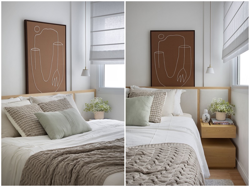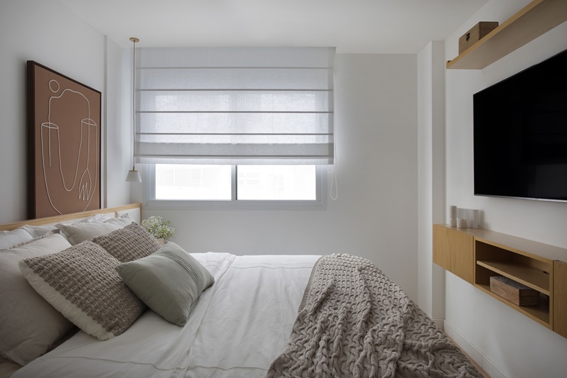No quarto do casal, a presença de materiais naturais também se destaca: o linho está no estofamento da cabeceira e na cortina romana, o sisal está no tapete e o algodão na roupa de cama. Para driblar a falta de espaço deste cômodo, as arquitetas desenharam uma cabeceira com aproximadamente 15cm de profundidade (alinhada com o pilar do lado direito) e um rebaixo no topo que serve de apoio extra para objetos, livros, quadros etc. “Nosso maior desafio no quarto foi otimizar ao máximo cada metro quadrado, já que precisávamos aproveitar a cama king size que os clientes já tinham. Já na área social, como a planta tinha muitos recortes e dentes, nosso maior desafio foi bolar soluções de layout e marcenaria que permitissem integrar ao máximo os espaços, principal pedido dos moradores“, finaliza Victoria.