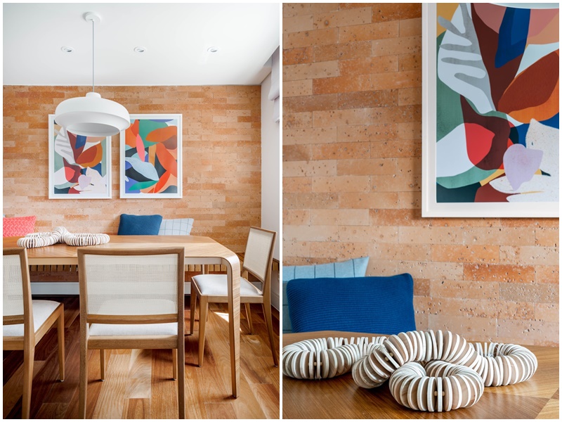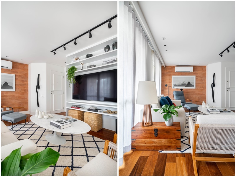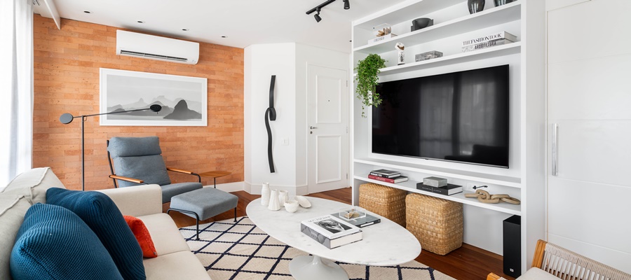 A paleta de cores neutra ficou mais aconchegante com os tijolinhos em tom terracota aplicados nas paredes. As cores estão presentes nos acessórios, como quadros e almofadas.