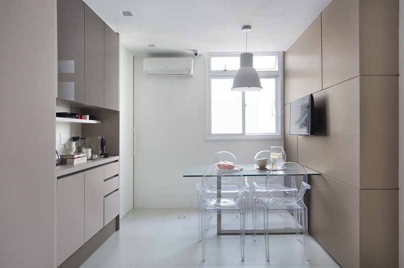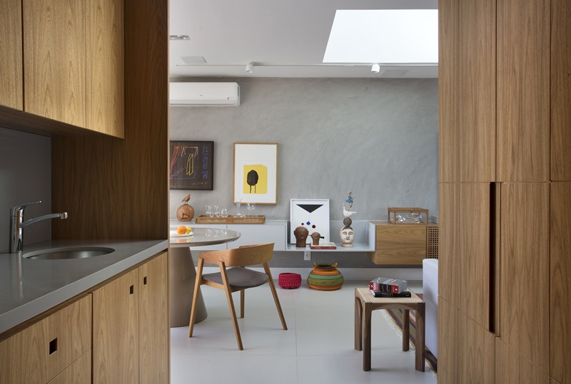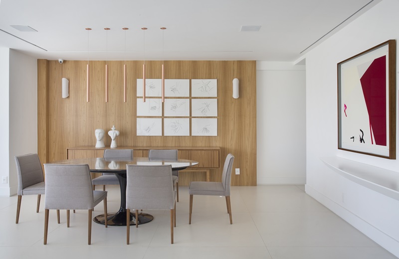 Execução da marcenaria pela Gênova Marcenaria e iluminação assinada pela Interpam Ipanema, com funcionalidade e simplicidade nas peças e na distribuição das luminárias.