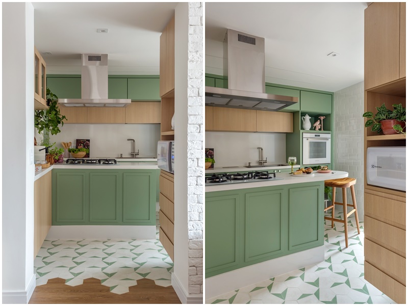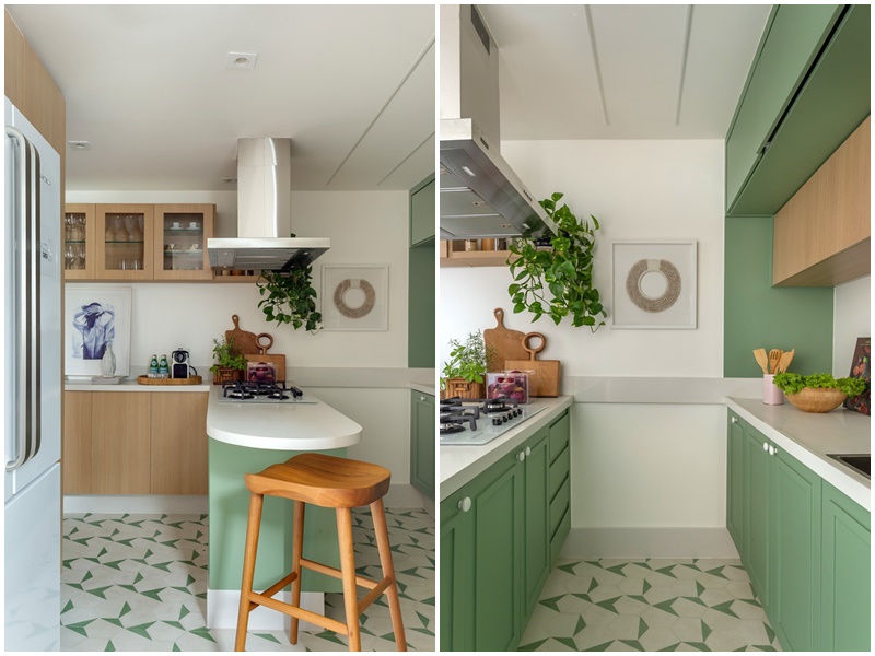 - Na cozinha, a arquiteta trabalhou com dimensões mínimas para otimizar o espaço, criando a ilha que era desejo das clientes, além de espaço de bancada para refeições rápidas.