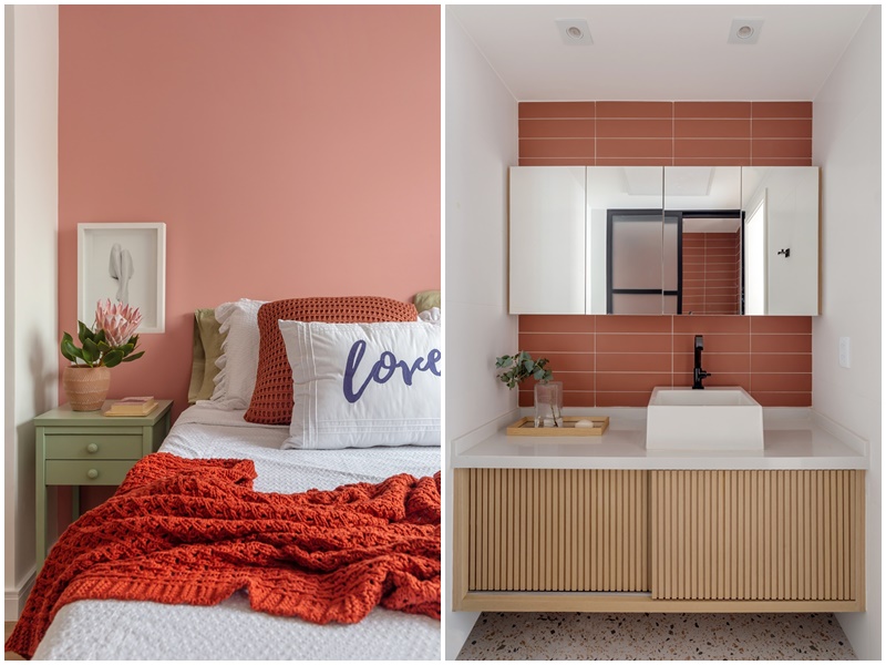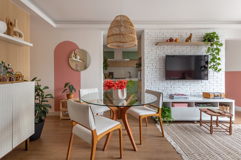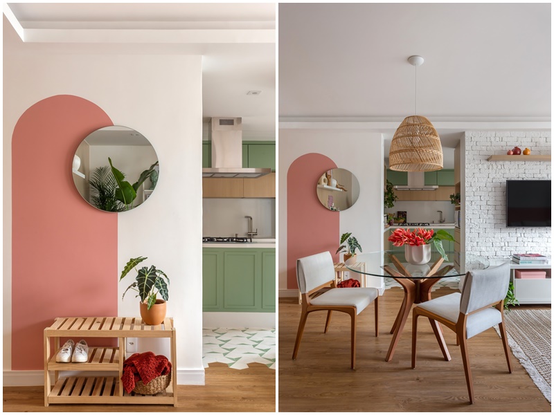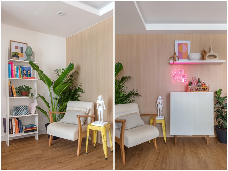 Na decoração, a arquiteta partiu das cores favoritas do casal – rosa e verde – para criar um lar descolado e alegre, com espaços otimizados e funcionais. Na sala, algumas peças foram aproveitadas do acervo das clientes, como o armário-bar e a estante de livros. Já o mobiliário novo é um mix peças brasileiras contemporâneas de design assinado (como os bancos de Sergio Rodrigues e cadeiras Anna de Jader Almeida), com peças de visual irreverente (o banco Toy azul, de Jayme Bernardo, é o melhor exemplo) e outras mais clássicas. “Como as clientes são mulheres, investimos em cores suaves para trazer feminilidade aos espaços, a exemplo da parede pintada de rosa e da cozinha verde menta, que pode ser vista da sala“, explica Amanda. Já a presença de materiais naturais, como o tapete e a luminária pendente de fibra, os móveis de madeira e as muitas plantas espalhadas por todo apartamento, deixaram o espaço mais acolhedor. Com acabamento amadeirado, o piso vinílico, o painel de parede da sala e alguns armários da cozinha contribuíram para reforçar esta sensação.