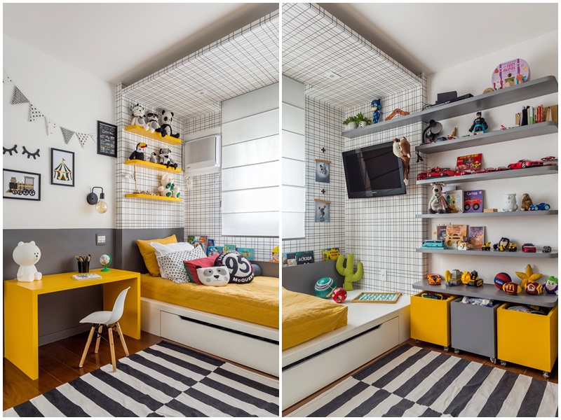 No quarto do filho, que adora carros, a arquiteta trabalhou com uma paleta predominantemente cinza, preto, branco e amarelo e lançou mão de espelhos para fazer o cômodo, de apenas 9m2, parecer maior. “Criamos uma caixa de marcenaria sobre a cama, revestida externamente com papel de parede, reforçando a ideia casulo de dormir“, detalha Amanda, que também Incluiu no projeto espaço para estudo, tv, livros, além de muitas prateleiras e baús para acomodar todos os carrinhos e brinquedos do menino.