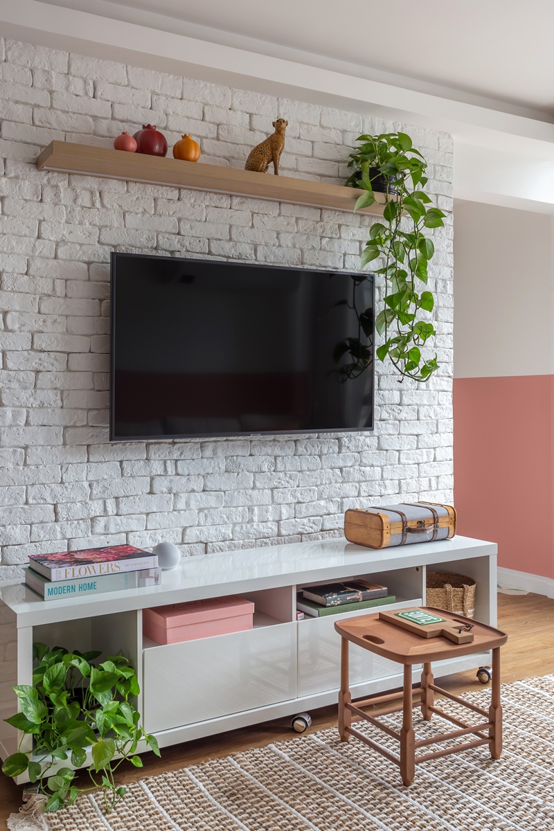 - Revestida com tijolinhos rústicos em tom off white, a parede da tv trouxe um ar mais descontraído e despojado para a sala.