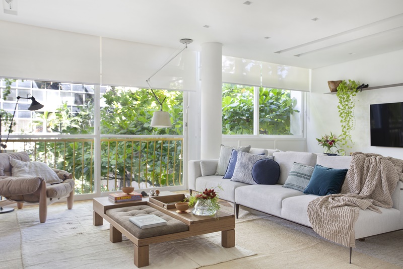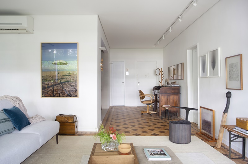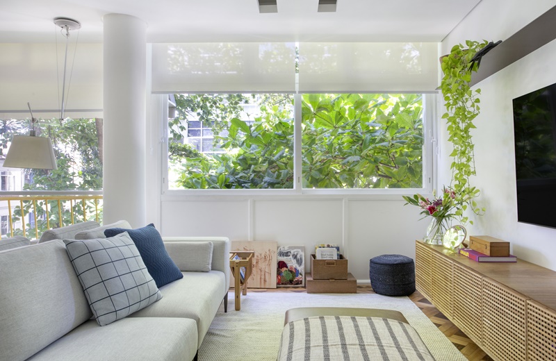 Localizado no Leblon, o apartamento fica no segundo andar de um edifício de 4 andares, bem na altura da copa das árvores, onde mora, inclusive, uma família de tucanos. A sacada da sala amplia a presença do verde no ambiente, deixando-o com ares de casa.
