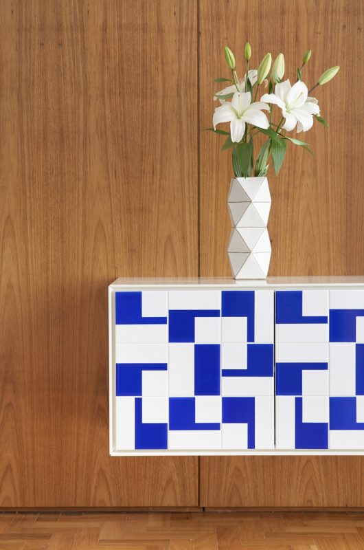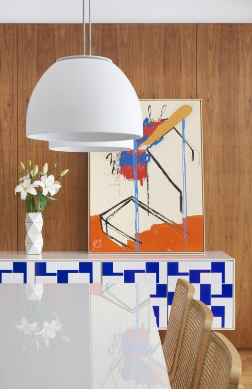 Outros pedidos nortearam o desenvolvimento do trabalho. Por exemplo, o australiano solicitou um cooktop embutido na bancada da cozinha voltada para a sala, além de armários inferiores azuis e superiores brancos, com portas e puxadores em estilo mais clássico que lembrassem a casa de seus pais, na Austrália. Também a pedido dele, o hall de entrada foi revestido com um papel de parede cuja estampa reproduz, de forma estilizada, uma floresta repleta de pássaros e macacos. “De imediato, ficamos na dúvida se funcionaria, mas, ao final, a ousadia imprimiu ainda mais personalidade ao projeto”, avalia Mabel, lembrando ainda que toda a decoração do apartamento é nova e cada escolha teve grande participação dos moradores. “O bufê da sala de jantar, com portas revestidas com azulejos modernistas de Athos Bulcão, também foi uma escolha do morador”, acrescenta ela.