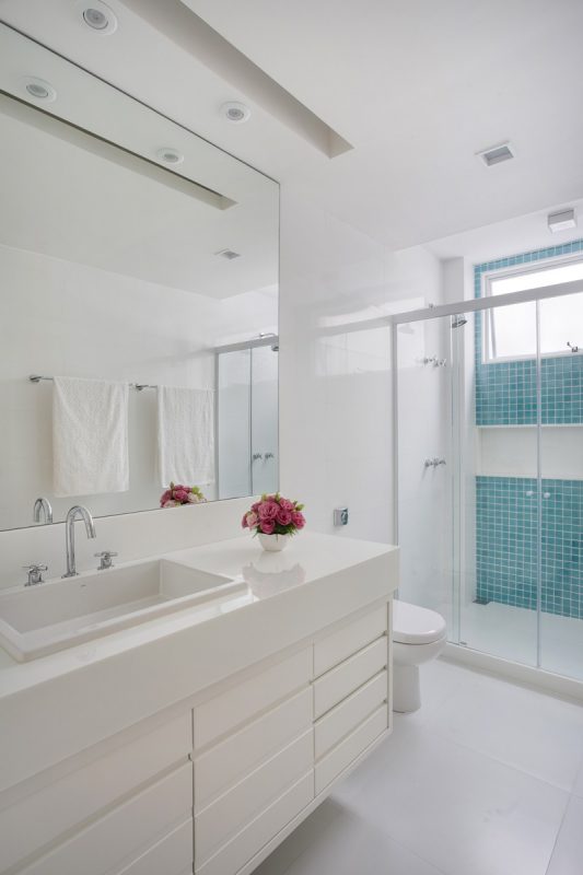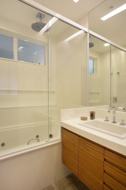Na nova planta, o quarto de empregada foi transformado no banheiro do casal, que solicitou a inclusão de uma banheira. Já o banheiro do corredor foi ampliado para uso das crianças, incorporando dois chuveiros no box, a pedido da mãe. O vão de acesso ao hall que dá acesso aos quartos foi ampliado ao seu limite máximo, deixando apenas os pilares estruturais. “No começo da obra, descobrimos que o piso original do apartamento, escondido sob o piso flutuante, era de taco de peroba-do-campo, e resolvemos recuperá-lo, já que o morador é apaixonado por madeira natural”, lembra Juliana.