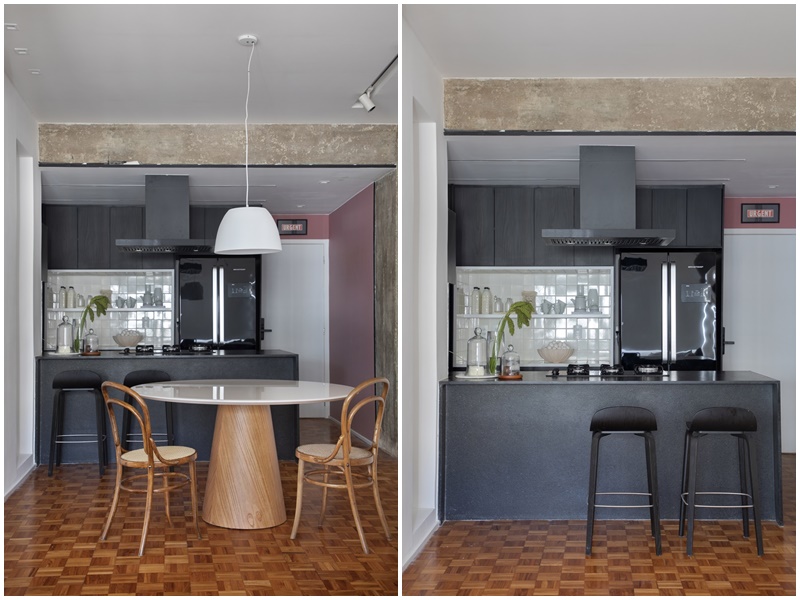 Após a execução da reforma, a cozinha foi integrada à sala e decorada em branco e preto. A marcenaria escura, de madeira ebanizada, por exemplo, ganhou um nicho central na parede ao fundo, integralmente revestido com azulejo branco, criando uma bancada seca de apoio na própria cozinha.