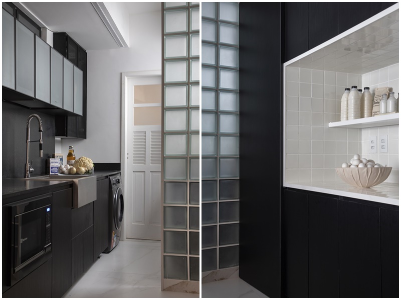 - A cozinha toda preta com madeira ebanizada, azulejos brancos e tijolos de vidro, que se contrapõe aos tons neutros e claros e à marcenaria em freijó predominantes na sala.
