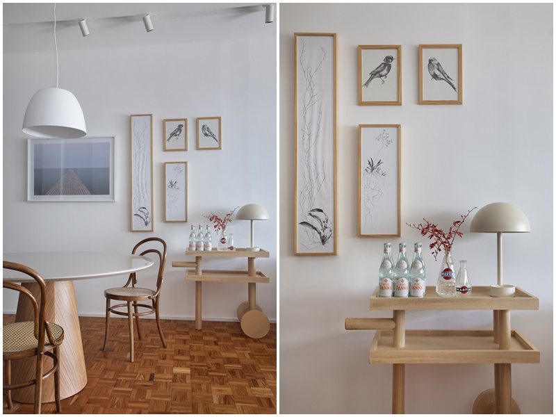 Na decoração, que segue um estilo jovem, descontraído e contemporâneo, com toques vintage, há peças que representam uma diversidade tanto estética como temporal. As clássicas cadeiras (de jantar) Thonet, a banqueta alta antiga com assento rosqueado garimpada no antiquário AD Studio e a poltrona modernista Beto assinada por Sergio Rodrigues convivem, por exemplo, em total harmonia com mobiliários contemporâneos, como o Carrinho Tapioca do designer Adalfan Filho, a mesa de centro Margem da dupla Luciana Martins e Gerson de Oliveira e mesa de apoio Vidro, do Guilherme Wentz, todos fornecidos pelo Arquivo Contemporâneo (@arquivocontemporaneooficial).