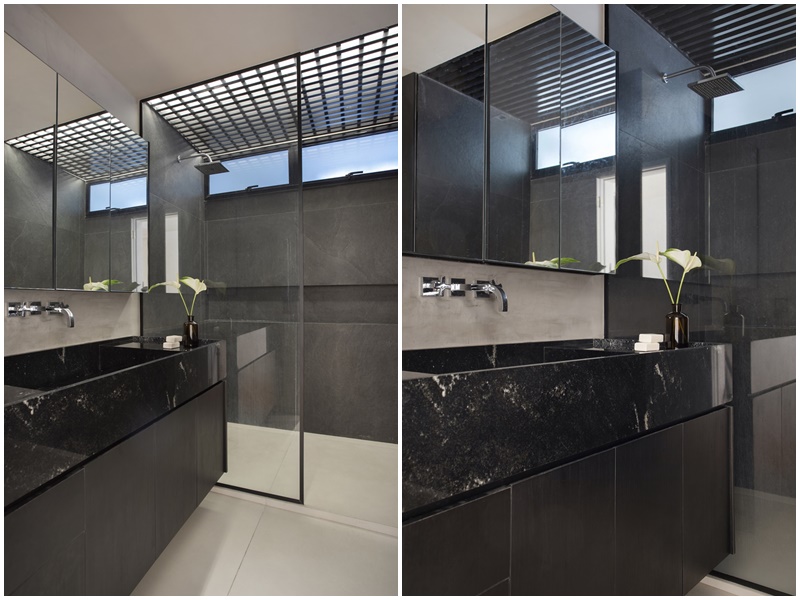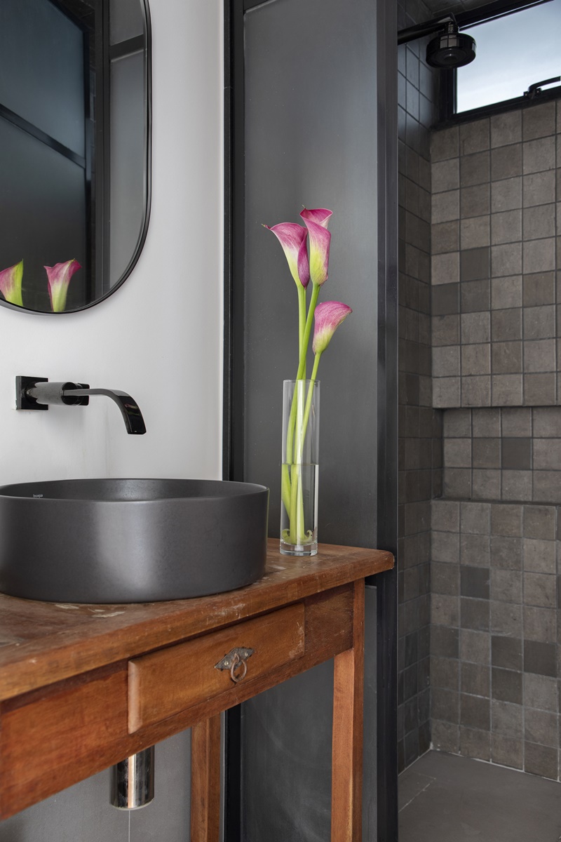O banheiro social é composto de materiais em tons de cinza e preto, sendo o interior do box num tom mais escuro (inclusive no piso e no teto) para criar uma sensação de “caixa”. Para deixa-lo com cara de lavabo, o arquiteto projetou uma esquadria piso/teto para esconder o chuveiro e, no lugar da bancada, instalou um móvel antigo comprado em antiquário, que foi restaurado para o novo uso.