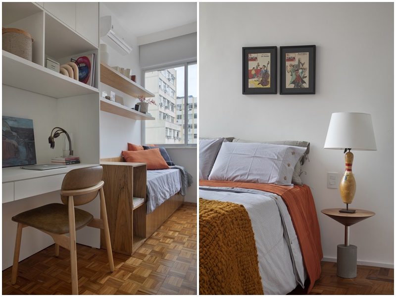 O escritório (home office) é um espaço de trabalho e estudo, com bastante armários para armazenamento e uma bicama, que também funciona como sofá. Já no quarto de hóspedes, o arquiteto usou mobiliários soltos e aproveitou algumas peças de acervo do morador.