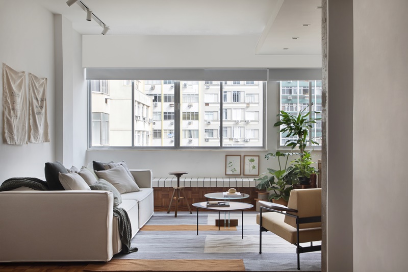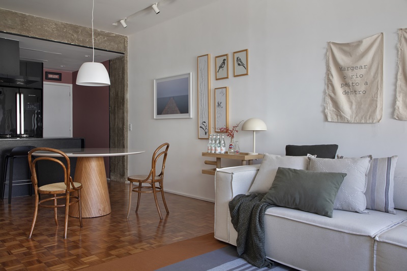 Na sala houve poucas intervenções, sendo a principal delas o banco azulejado posicionado embaixo e ao longo de toda a grande janela, com o taco do piso subindo a parede até o limite do assento para criar a sensação de continuidade. O arquiteto também descascou pilares e vigas, deixando-os aparentes em concreto bruto para trazer um pouco da atmosfera industrial para o espaço.