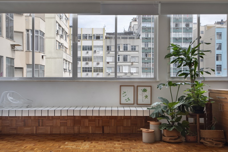 - O banco azulejado na sala faz, embaixo da grande janela, que tornou a sala mais ampla e conectada aos demais espaços, além de oferecer assentos extras em dias de casa cheia.
