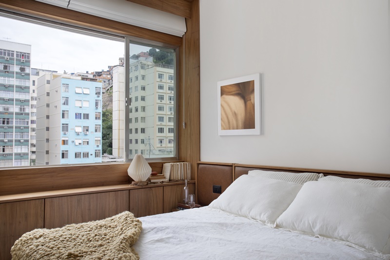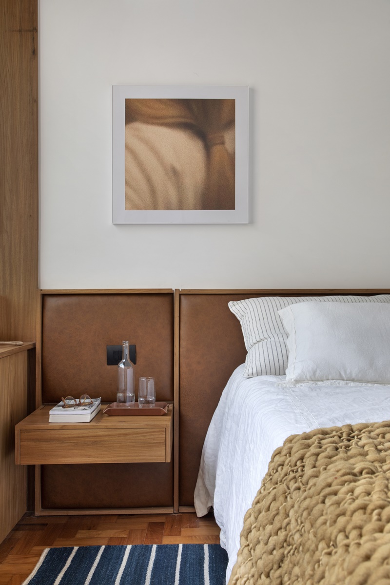 Na suíte do morador, o arquiteto projetou uma marcenaria em freijó que “emoldura” a vista da janela e cria, embaixo dela, um armário estreito com espaço extra de armazenamento. O couro marrom da cabeceira, os tecidos (de algodão, linho e lã) da roupa de cama e a madeira da marcenaria são elementos naturais que ajudaram a reforçar a sensação de aconchego e acolhimento no dormitório. Segundo Panaggio, o banheiro da suíte é um dos pontos altos do projeto. “Apostamos em um espaço relaxante, em tons mais escuros e com luz difusa para proporcionar um banho tranquilo após um dia conturbado. Usamos revestimento preto dentro do box e aplicamos no teto um painel metálico tipo muxarabi, também preto, para criar uma sensação de caixa escura. Já a parede da bancada foi revestida com cimento queimado“, explica Panaggio.