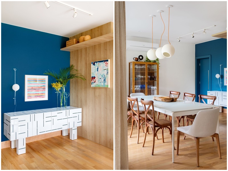 Já entre as obras de arte, vale destacar o quadro colorido sobre o buffet do artista Marcelo Catalano, as aquarelas da artista Andréa Menezes e a tela grande em tons de azul do artista Herton Roitman.