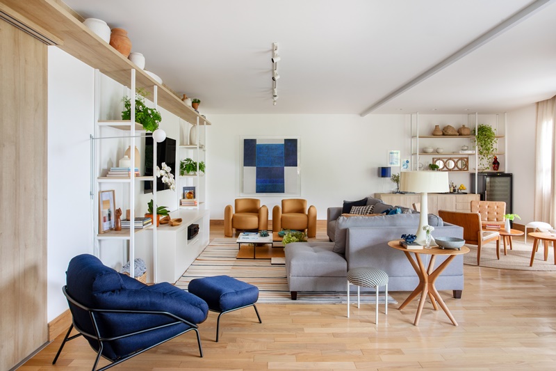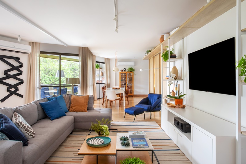 Para criar uma atmosfera aconchegante de casa, os arquitetos apostaram em uma paleta composta predominantemente de tons suaves e pontuaram o décor com azul (na parede da entrada, em alguns móveis, quadros e almofadas) e ocre (no par de almofadas da sala de estar). A madeira também se destaca no espaço – ela está presente no piso de tauari natural, no acabamento das marcenarias (sendo algumas estruturas mescladas com ferro) e em alguns móveis. “Esta sala tem uma simplicidade que traduz bem o estilo carioca. Ela é chique, mas ao mesmo tempo também é despojada, sem pompa“, avalia Ricardo.