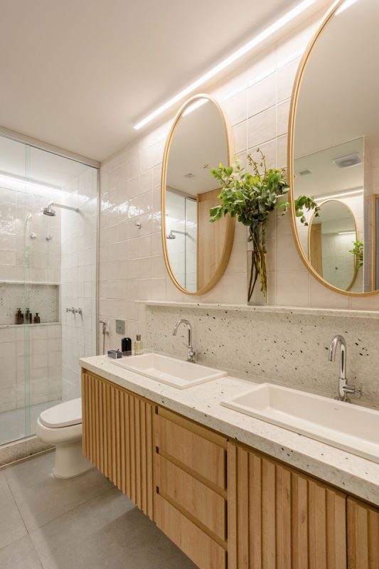 - Os arquitetos usaram o mesmo conceito nos dois banheiros, com destaque para as paredes revestidas com cerâmicas da linha Olaria, da Roca, de aspecto natural.