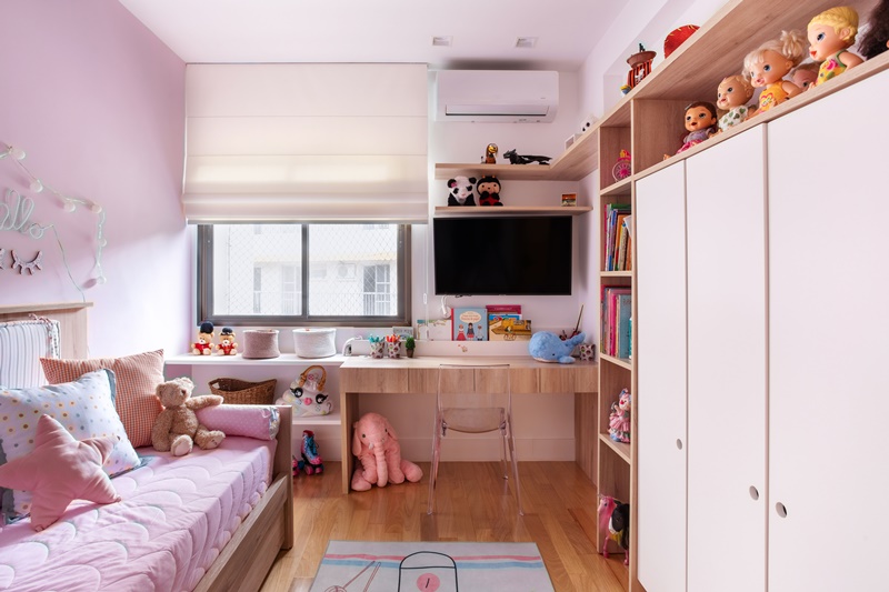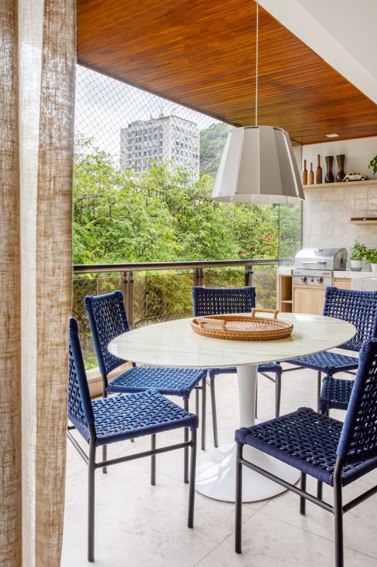 Em busca de mais espaço e conforto para a família, o casal na faixa dos 40 anos (ela, advogada; ele, consultor financeiro), com duas filhas (uma de 8 e outra de 12 anos), comprou este apartamento de 230m2, no Humaitá, bairro na zona sul do Rio de Janeiro). Antes de se mudarem para o novo endereço, os novos proprietários encomendaram aos arquitetos Ricardo Melo e Rodrigo Passos um projeto de renovação, pontuando, no primeiro contato, que desejavam poucas mudanças. No decorrer do processo, no entanto, eles se empolgaram e acabaram optando por fazer uma reforma completa, de todos os cômodos. “No final das contas, os clientes pediram para integrar a cozinha com a sala, modificando totalmente o formato dela e, consequentemente, da área de serviço. Eles também pediram para resolver uma planta em ângulos, bem complicada, e dispor de espaços confortáveis para receber amigos, como um bar e uma varanda equipada com churrasqueira, máquina de gelo e cervejeira“, conta Ricardo Melo.