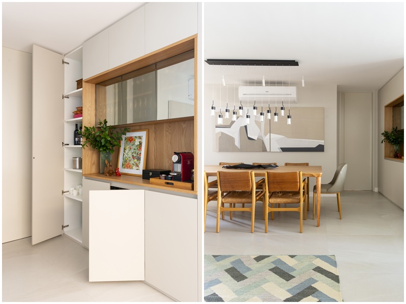 Próximo à mesa de jantar e à porta que dá acesso aos aos quartos, a arquiteta instalou um armário que funciona como rouparia, louceiro e cristaleira, com um nicho central que pode ser iluminado e usado como aparador.