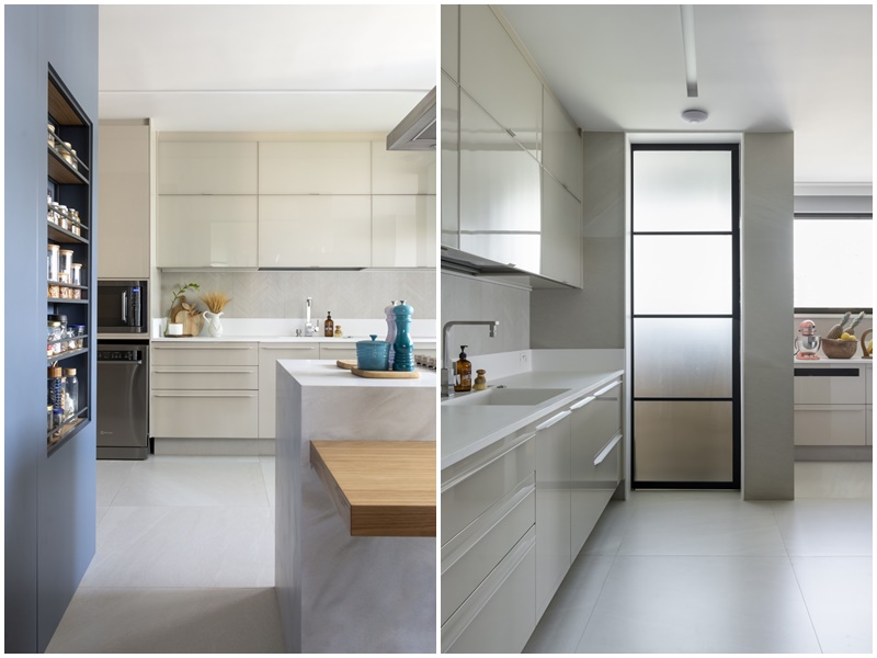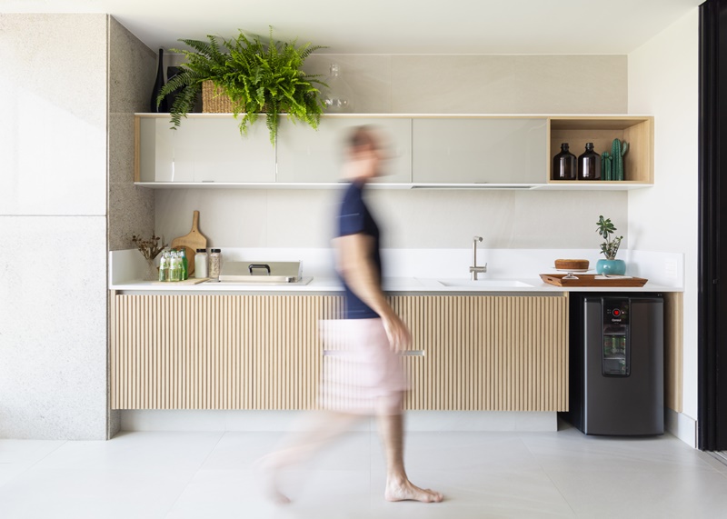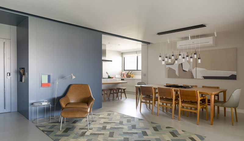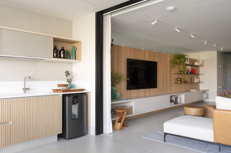 Na área social, a arquiteta apostou no contraste da marcenaria de carvalho natural com a laca azul, cor presente no painel de parede que começa no hall de entrada e termina dentro da cozinha, camuflando o acesso ao lavabo. A parte superior da estante da sala ganhou uma faixa de espelho em toda a sua extensão para deixar o ambiente mais leve e iluminado. “Usamos o mesmo piso de porcelanato cinza claro, com formato grande, na área social, cozinha e varanda, não só para criar uma unidade visual como também para aumentar a sensação de amplitude“, justifica Paula.