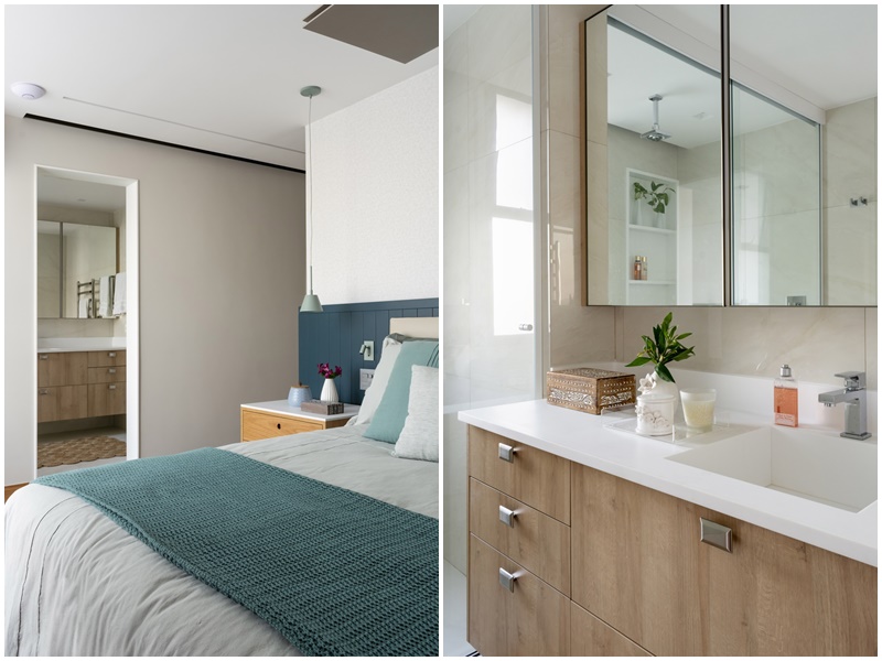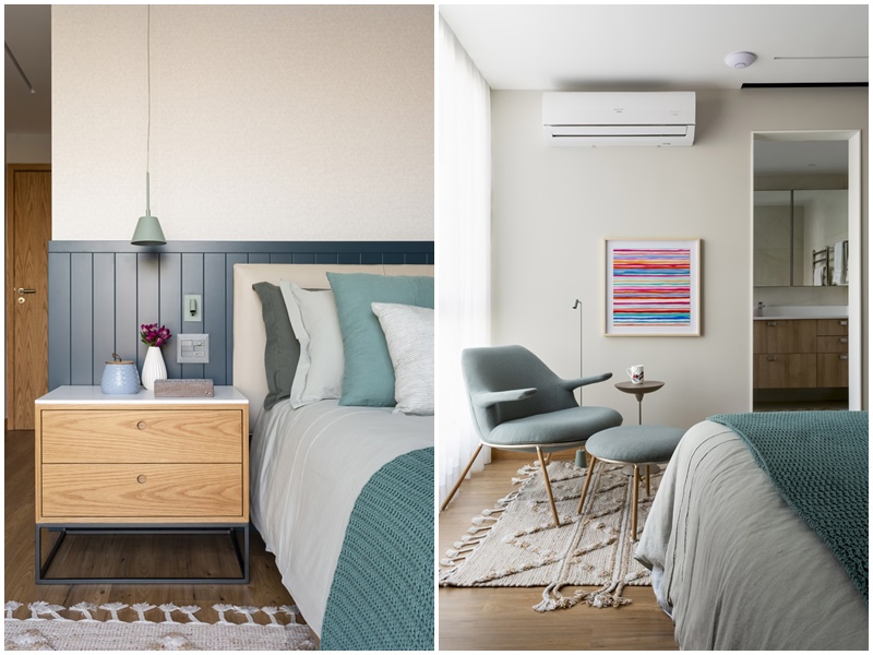 No quarto do casal, a posição da cama voltada para a janela garantiu a plena vista da paisagem externa a partir dela e deu mais privacidade aos clientes, já que o vizinho não consegue vê-los da varanda. No décor, a combinação de carvalho natural, azul e verde sálvia (presente nas luminárias, roupa de cama e estofamento da poltrona) deixou o ambiente mais suave e acolhedor.