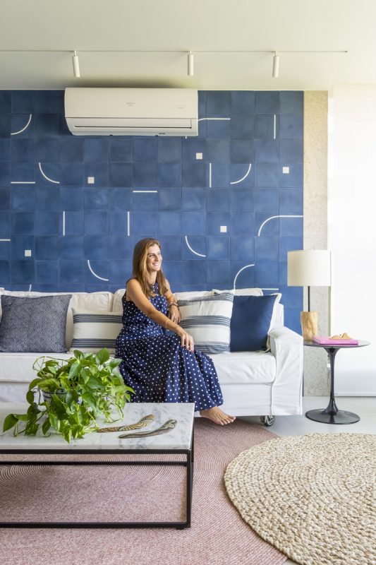 Já na varanda integrada à sala, a parede revestida com ladrilhos hidráulicos azuis rouba a cena, em contraste com o piso e a marcenaria, ambos com tonalidade clara. Tons rosados aparecem no tapete e no estofado da poltrona.