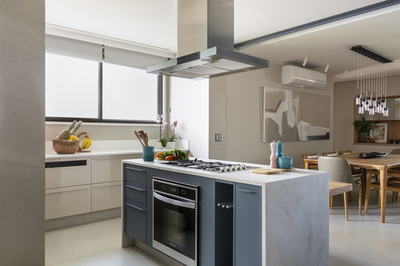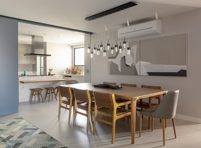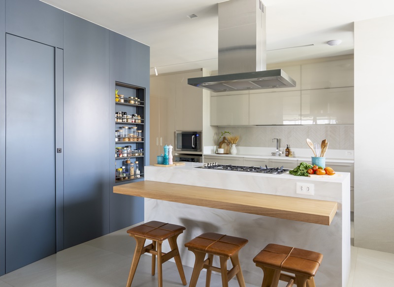 Na cozinha aberta para a sala de jantar, a arquiteta destaca a ilha executada em corian, com aspecto mais rústico, com uma bancada de apoio engastada, em madeira, que serve de apoio para a refeições rápidas do dia-a-dia. Outro destaque é o lavabo camuflado no painel azul, com paredes internas e teto revestidos com painel de carvalho natural, espelho grande com design orgânico e cuba esculpida na própria pedra.