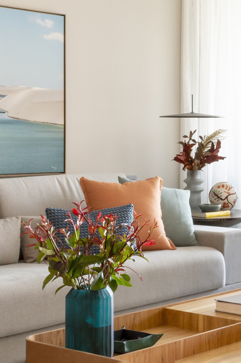O projeto buscou criar um lar de estilo contemporâneo, com toques modernos, que não fosse totalmente neutro ou sem graça. Para deixar os ambientes com mais personalidade, a arquiteta usou materiais, texturas, acabamentos e cores contrastantes em praticamente todos os cômodos. No que se refere à decoração, alguns objetos decorativos que os clientes já tinham foram aproveitados, especialmente as lembranças de viagens. No quesito “mobiliário”, com exceção dos pufes na sala, do sofá e da mesa de centro da varanda e das banquetas da cozinha, todos as peças são novas, compradas de acordo com as especificações do novo projeto.