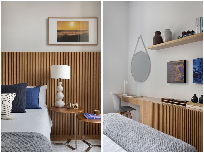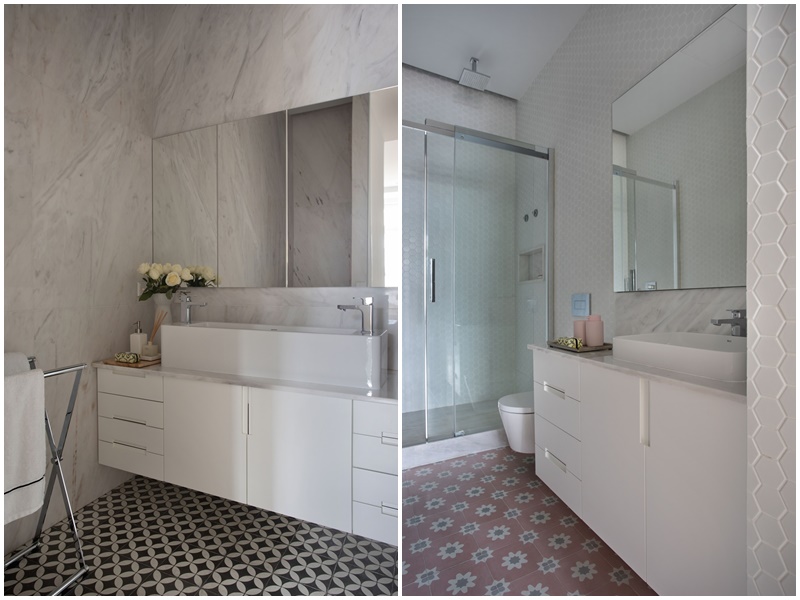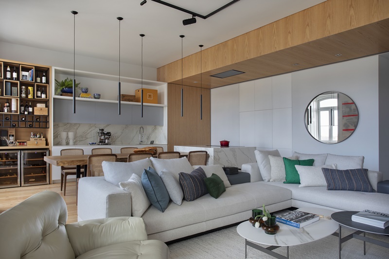 Na sala com cozinha integrada, se destacam: a porta ripada que camufla a despensa e segue o alinhamento do rebaixo de teto em marcenaria, permitindo, inclusive, camuflar o ar condicionado; a adega que fica integrada à área de refeições, facilitando o dia-a-dia do morador; o cooktop na ilha com a coifa camuflada no teto forrado com marcenaria; a posição do cooktop, que permite ao morador cozinhar enquanto conversa com os amigos sentados à mesa de jantar, acoplada à ilha. Já nos banheiros, o destaque fica por conta dos pisos de ladrilho hidráulico, sugerido pelo próprio cliente, que buscava um visual mais vintage.