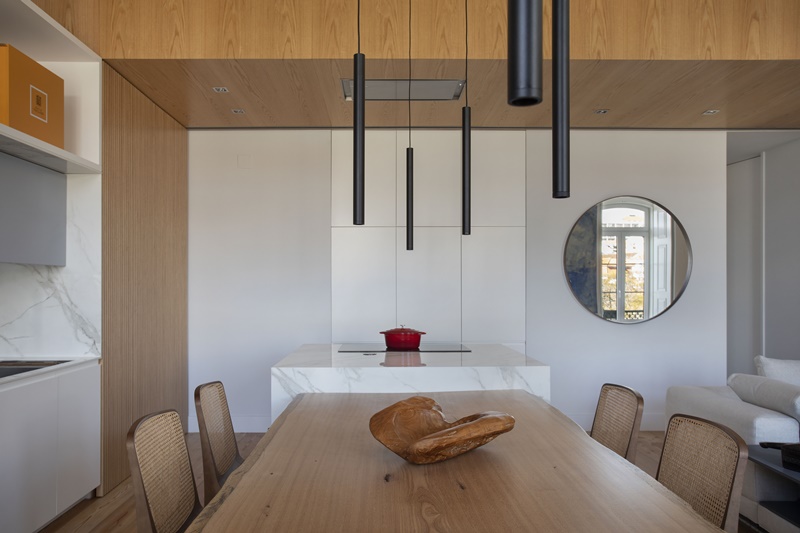 Entre as principais modificações na planta do imóvel, a arquiteta mudou a posição da cozinha e a integrou com sala, já que o cliente gosta de cozinhar e receber em casa. Além disso, como o apartamento possuía somente dois banheiros (sendo um deles na suíte do quarto principal), a alteração do layout permitiu criar três suítes e um lavabo. Por fim, a circulação íntima foi deslocada para criar uma lavanderia compacta, já que tanque de serviço em casa não faz parte da cultura portuguesa.